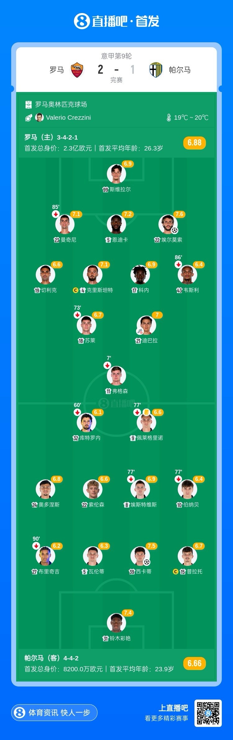 全场比赛结束,罗马主场2-1战胜帕尔马。